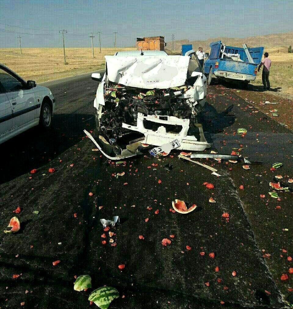 برخورد یک دستگاه خودروی سواری سمند با یک وانت که بار هندوانه داشت جاده را هندوانه ای کرد!