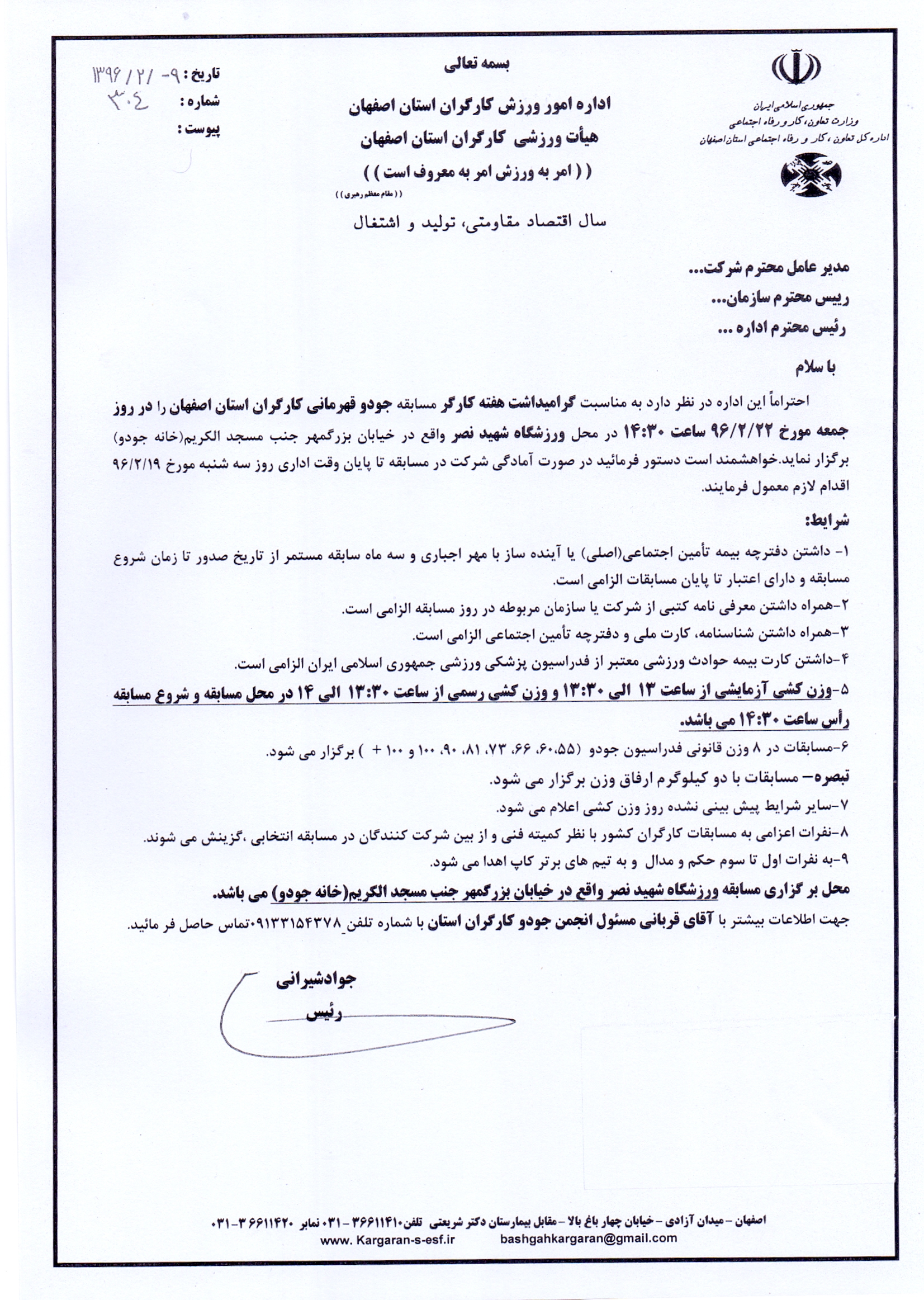 بخشنامه مسابقات جودو گرامیداشت هفته کارگر قهرمانی کارگران استان اصفهان اعلام شد