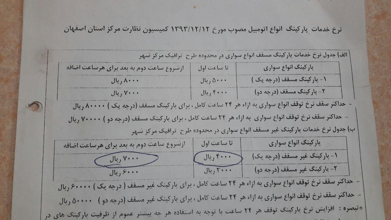 وی افزود: براساس نرخ مصوب خدمات پارکینگ انواع اتومبیل که در سال 93 توسط کمیسیون نظارت استان اصفهان به تصویب رسیده است، نرخ پارکینگهای مسقف تا ساعت اولیه به مبلغ 800 تومان و به ازای هر ساعت اضافه بین 500 تا 600 تومان متغیر است که از سال 93 تاکنون هیچ تغییری نکرده است.