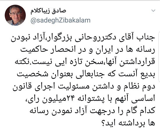 برترین ها: صادق زیباکلام، تحلیلگر سیاسی در توییتر خود خطاب به روحانی نوشت: جناب آقای دکتر روحانی بزرگوار، آزاد نبودن رسانه ها در ایران و در انحصار حاکمیت قرار داشتن آن ها، سخن تازه ایی نیست.