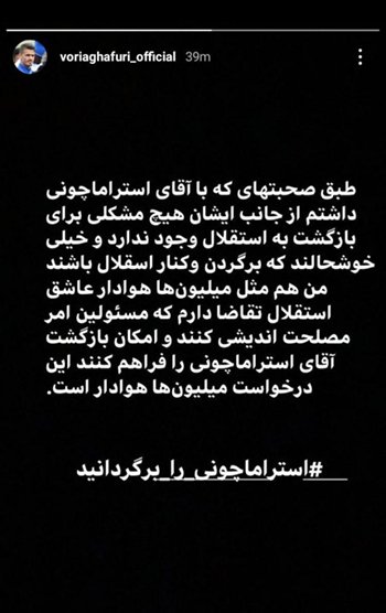وریا غفوری کاپیتان استقلال که قراردادش را با آبیها تمدید کرد پیش از سفر به دوحه قطر در صفحه شخصیاش بار دیگر از بازگشت استراماچونی نوشته شده است.