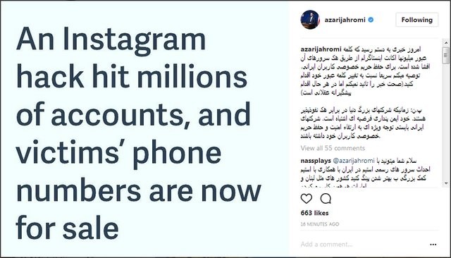 پس از خبر هک شدن چندین میلیون حساب اینستاگرامی، وزیر ارتباطات و فناوری اطلاعات از کاربران این شبکه اجتماعی خواست برای حفظ حریم خصوصی و در راستای اقدامات پیشگیرانه، رمز عبور خود را تغییر دهند.